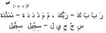 | シャッダとは次のように文字の上に、小さなwのようなマークを付け、同じ文字がダブり促音の発音をするものを表す。 |