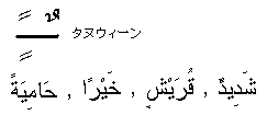 | タヌウィーン(tanwi:n)とは、NU:Nを作りという意味で、動詞と助詞以外の限定されない語(名詞、形容詞、副詞など)の最後にNUNを付け加えて読むものである。書き方は、下図のとおりである。 |