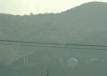 | 香川県綾歌郡綾歌町の町役場から南の山を臨むと、中腹に青く美しく鈍い光を放つドームをみることができる。「え〜っ。マジ!モスクじゃない?」目を疑いたくなるような美しいドームが光を放っているのである。なんと名づけようか。「綾歌町モスク」。これぞ日本最大の幻のモスク『綾歌町モスク』である。 | |