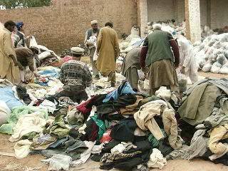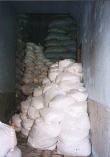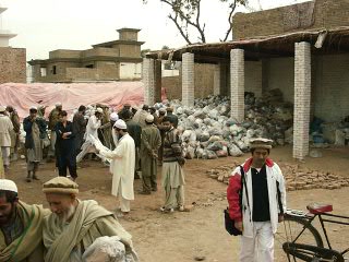 ペシャーワルのM.D.I.の配給所は、忙しそうに難民支給用のパックを作っていた。中味は、米、古着、靴である。もしものことがあればと、多数のパックを準備しているのだ。 | |