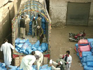 配給所の鉄の扉のまえには黒山の人だかりだ。鉄の扉越しに次々とファミリーパックを渡していった。もらって帰る人,やってくる人と往来はひっきりなし。また、ペシャワルとイスラマバードの両方から次々と到着するトラックをありがたく迎える沿道の難民たちの顔が見える。着ている服は、昨日一昨日に渡した服なのだろうか、今日は少しいい服を着ている人が多かった。イードが一日伸びることにより、本日集まった人たちに食糧が行き渡り、あすのイードは、たらふく美味しいイード料理が食べれることであろう。 みなさんの援助に感謝します。 |