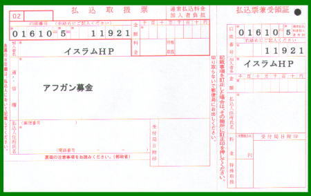 | ラマダーン月22日までに集まった現金を、在日パキスタン人代表と日本人代表が携え、現地に赴き、食料/衣料を買い込み、アフガニスタンの難民キャンプで配布します。・・・(戦況により、日本人の入国が不可能な場合は、パキスタン人のみになることがあります。選ぶ代表は信頼のできる人なのでご安心ください。配布の様子は帰国後このHPで紹介します。) | ||||