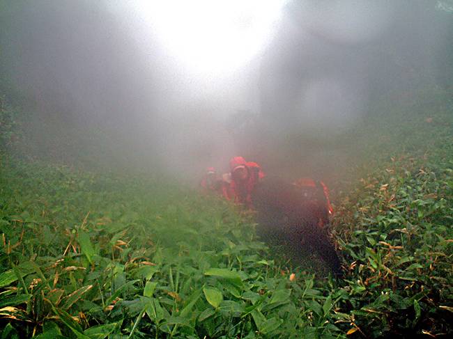 矢筈岩下の笹の急登をびしょ濡れになりながら進む