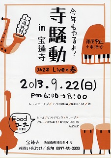 今年も猛暑や大雨が各所で続いてますが、皆様の所は如何ですが?お見舞い申し上げます。さて、この所恒例になっております寺騒動と銘打ったJAZZコンサートが西条市の宝蓮寺境内で今年も行われます。今年は9月22日(日)午後6時から、ヴァイオリン演奏もあるそうですよ。入場無料だそうですから、興味のある方は是非ご参加下さい。問い合わせ先は、0897−55−3030です。