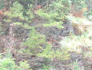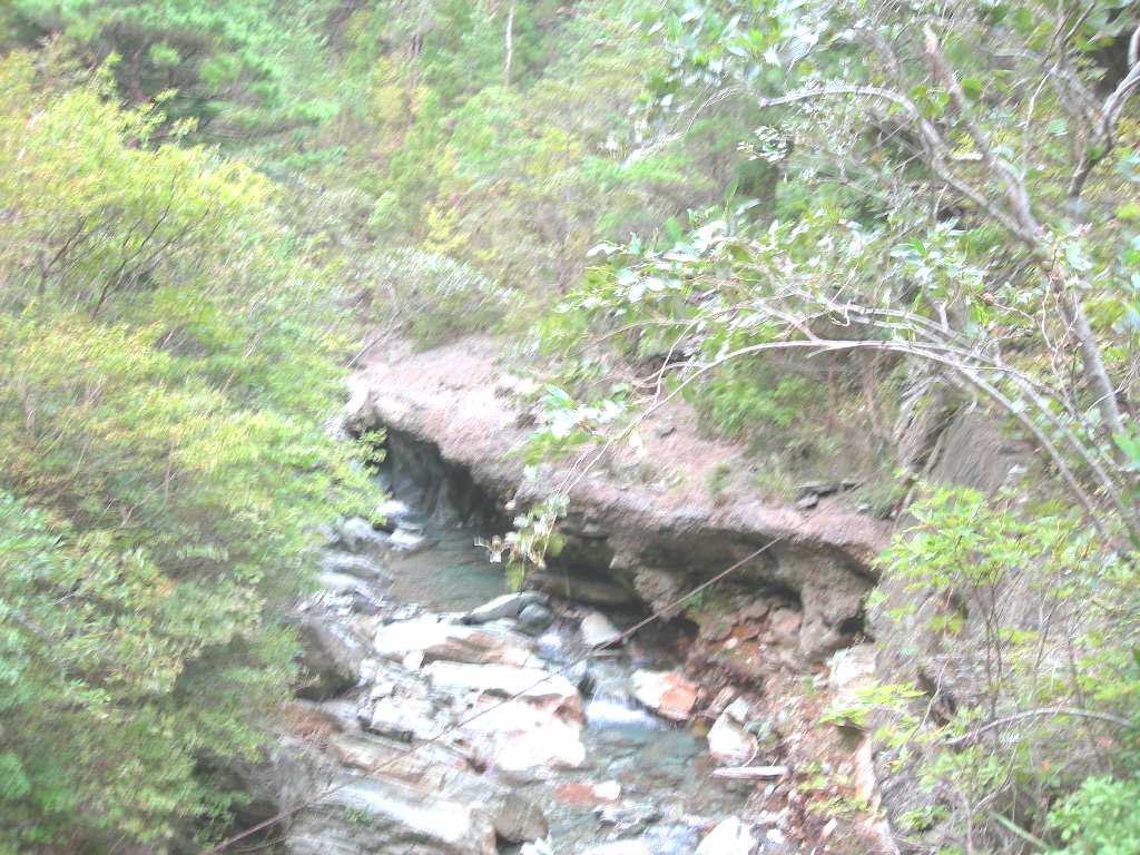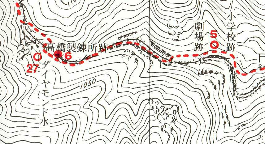 | ダイヤモンド水の近くには石垣が認められる。 この石垣は、昔、高橋精錬所があったところという。 高橋精錬所は、旧別子側の本格的精錬所で、ここで精錬された粗銅は、第一通洞、上部鉄道、索道、下部鉄道を通じて惣開精錬所へ送られ精製されていた。 当初、精錬施設の新居浜側移転に伴い、規模が縮小される予定であったが、新居浜側の山根精錬所、新居浜精錬所の煙害問題発生により、四阪島精錬所完成まで規模が拡張された。しかし、明治32年、台風による別子大水害の発生により施設は殆どが大破し、精錬機能を失う結果となった。 現在、ダイヤモンド水の対岸から黒橋までの辺りまで見られる石垣は、高橋精錬所の洋式溶鉱炉、沈殿池、倉庫などの跡とのこと。 |   |