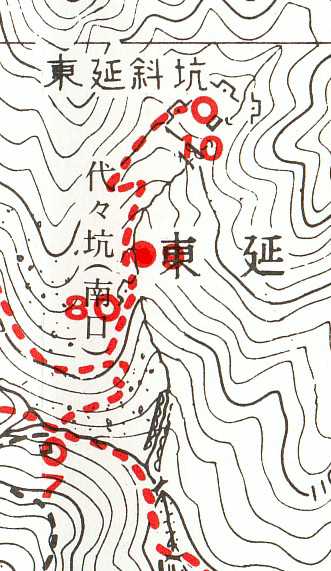 東延斜坑は明治7年(1894)住友家の招いたフランスの鉱山技師ルイ・ラロックの計画に基づき、明治9年に着工 同28年(1895)に完成を見たもので北東から南西に49度の傾斜で526m掘り下げられ八番坑道迄達している。