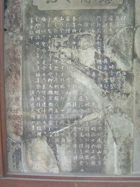 明治23年、別子開坑200年を記念して建てられた石碑であり、嘉永年間に清水総右衛門が開いた惣開の地に、鎔鉱試験炉および実証炉のピロチェ炉を設置したことを記録している。 惣開は日本の臨海工業地帯のさきがけであり、工都としての新居浜のスタートを記念する重要な石碑である。 この石碑は、当初は住友化学歴史資料館のある所に建てられていたが、その後、一時は住友化学の倉庫の中で眠っていたという。 住友化学の重役の方が、この重要な石碑の存在を知り、住友化学愛媛工場の中に移された。工場の敷地内のため、暫くの間は一般の人は見ることができなかったが、最近になって住友化学歴史資料館の敷地内に戻された。 |